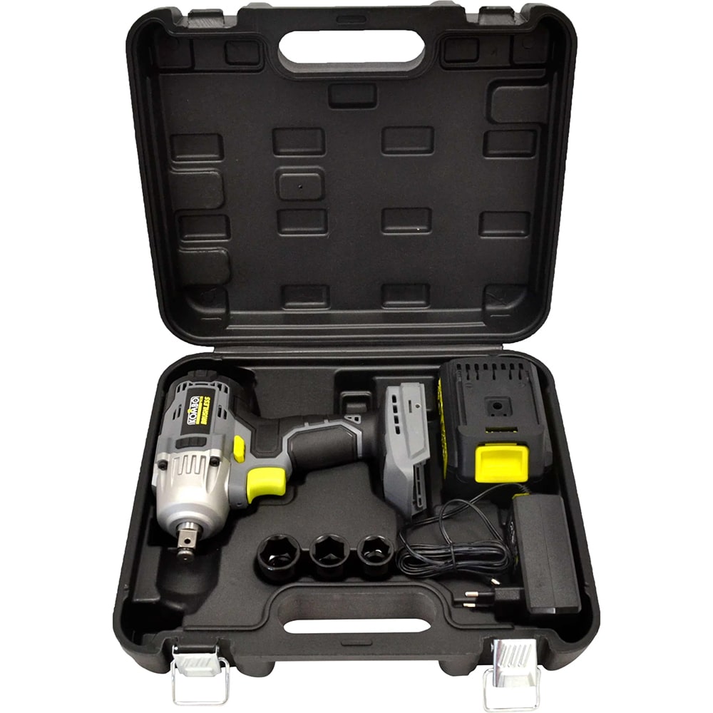 1 avvitatore, 1 batteria 20V 4Ah, 1 caricabatteria 2,2A (tempo di ricarica 120 min), 3 bussole esagonali in Cr-V (17, 19, 21 mm), valigetta in plastica con cerniere in metallo.