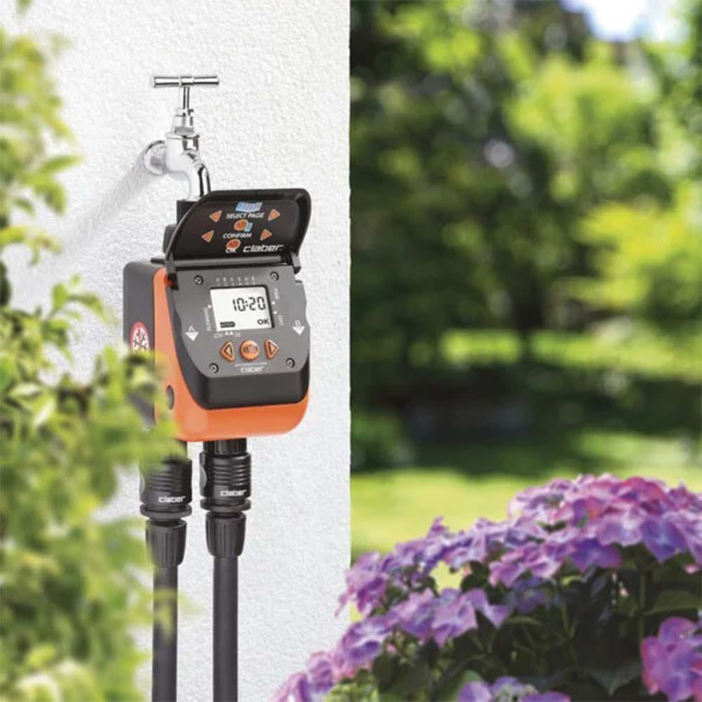 Programmatore automatico a due vie. Effettua fino a tre irrigazioni al giorno per ciascuna linea. Ha solo tre tasti per programmare con facilità. Il display di grande formato comunica chiaramente con simboli e numeri tutte le informazioni necessarie. Tempi di irrigazione da un minuto a 23 ore e 59 minuti. Programmazione settimanale con esclusione dei singoli giorni. Permette di visualizzare i programmi inseriti e di effettuare cancellazioni. Funzione manuale implementabile da 15 a 60 min. Impostazione del giorno corrente. Dotato di filtro lavabile. Attacco rubinetto 3/4” (20-27 mm). Funziona con una batteria alcalina da 9 V sufficiente per l’intera stagione (indicatore digitale dello stato di carica). Parte elettronica resistente alla pioggia e all’umidità. Collegabile con il sensore di pioggia Rain Sensor, per un’irrigazione assolutamente senza sprechi. Pressione di esercizio da 0,5 a 10 bar. Controllato e testato al 100%.