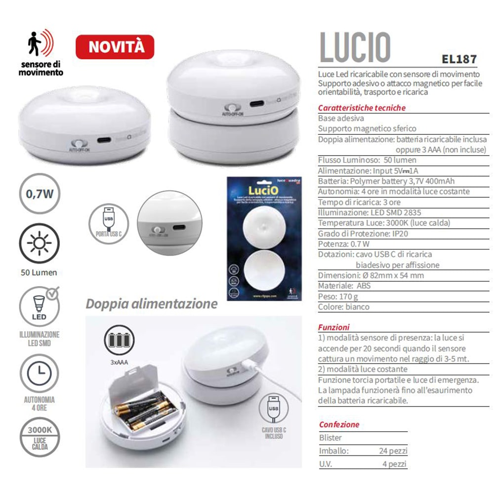 Luce Led ricaricabile LUCIO con sensore di movimento.