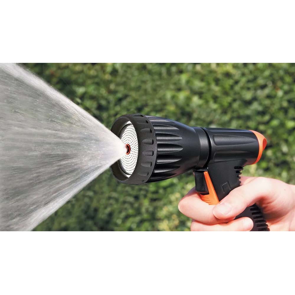 Pistola multifunzione con impugnatura anatomica gommata e comodo meccanismo anteriore a pulsante per l’apertura e la chiusura del flusso. Manopola posteriore per regolare la portata d’acqua. Ghiera in gomma con funzione antiurto, apribile, ispezionabile e pulibile. Ruotando la ghiera si ottengono quattro getti diversi: doccia, concentrato, diffuso a ventaglio e nebulizzato.