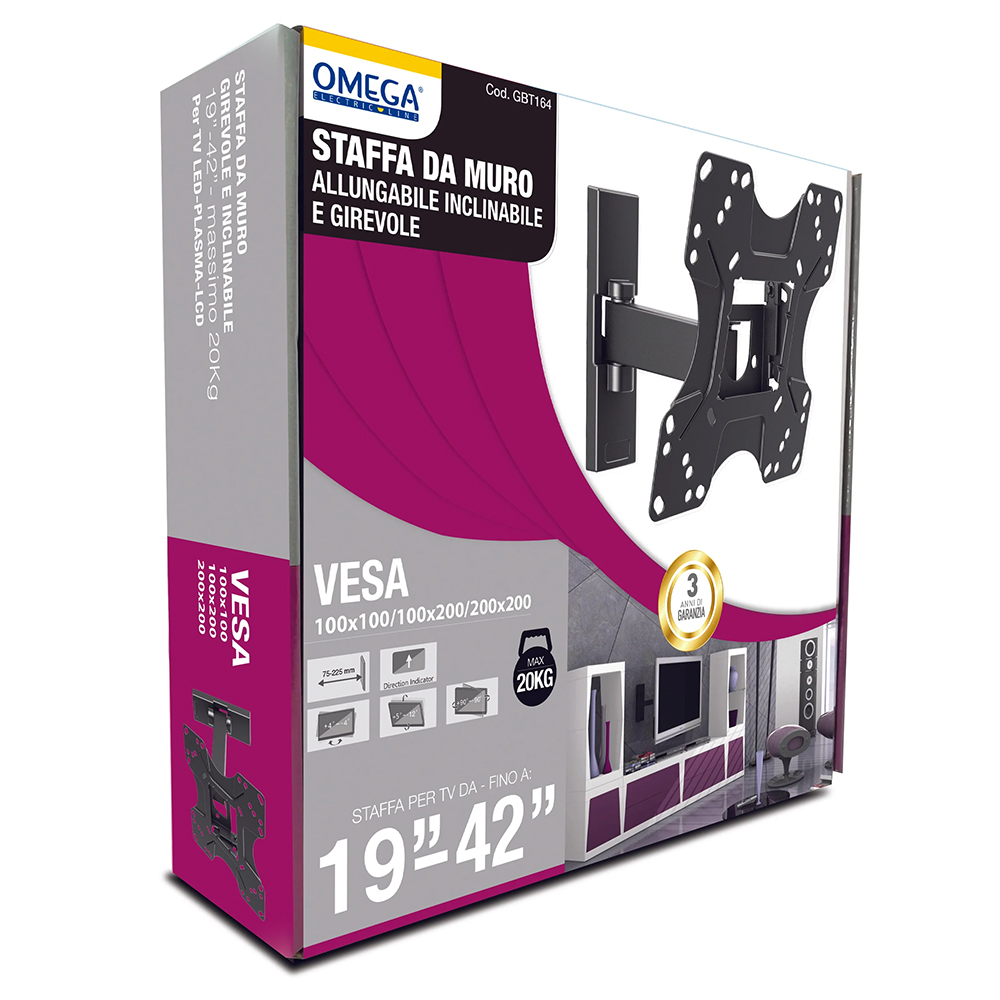 Staffa tv a parete snodata 3 snodi per tv 19"-42" max 20 kg. vesa max 200 x 200 OMEGA